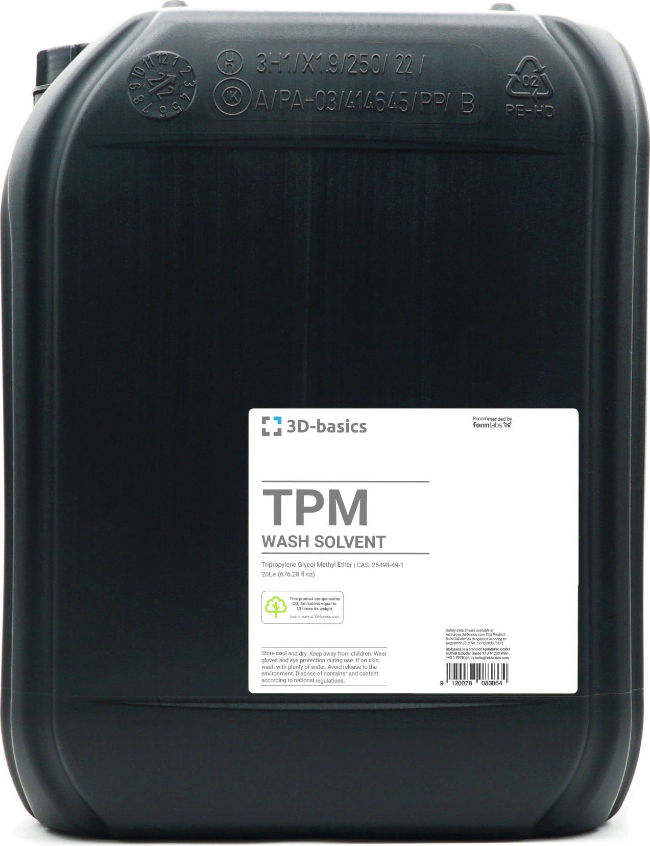 TPM Wash Solvent od 3D-basics je rozpúšťadlo s nízkym zápachom a vysokou účinnosťou s čistotou ≥ 99 %, ktoré sa používa pri rozpúšťaní nevytvrdeného resinu na dieloch vytlačených technológiou SLA. TPM (monometyléter tripropylénglykolu) je nehorľavý, má nižšiu rýchlosť odparovania ako napríklad izopropanol (IPA) a dokáže tiež rozpustiť oveľa viac živice (až 4-násobne) ako iné bežné rozpúšťadlá na trhu.
