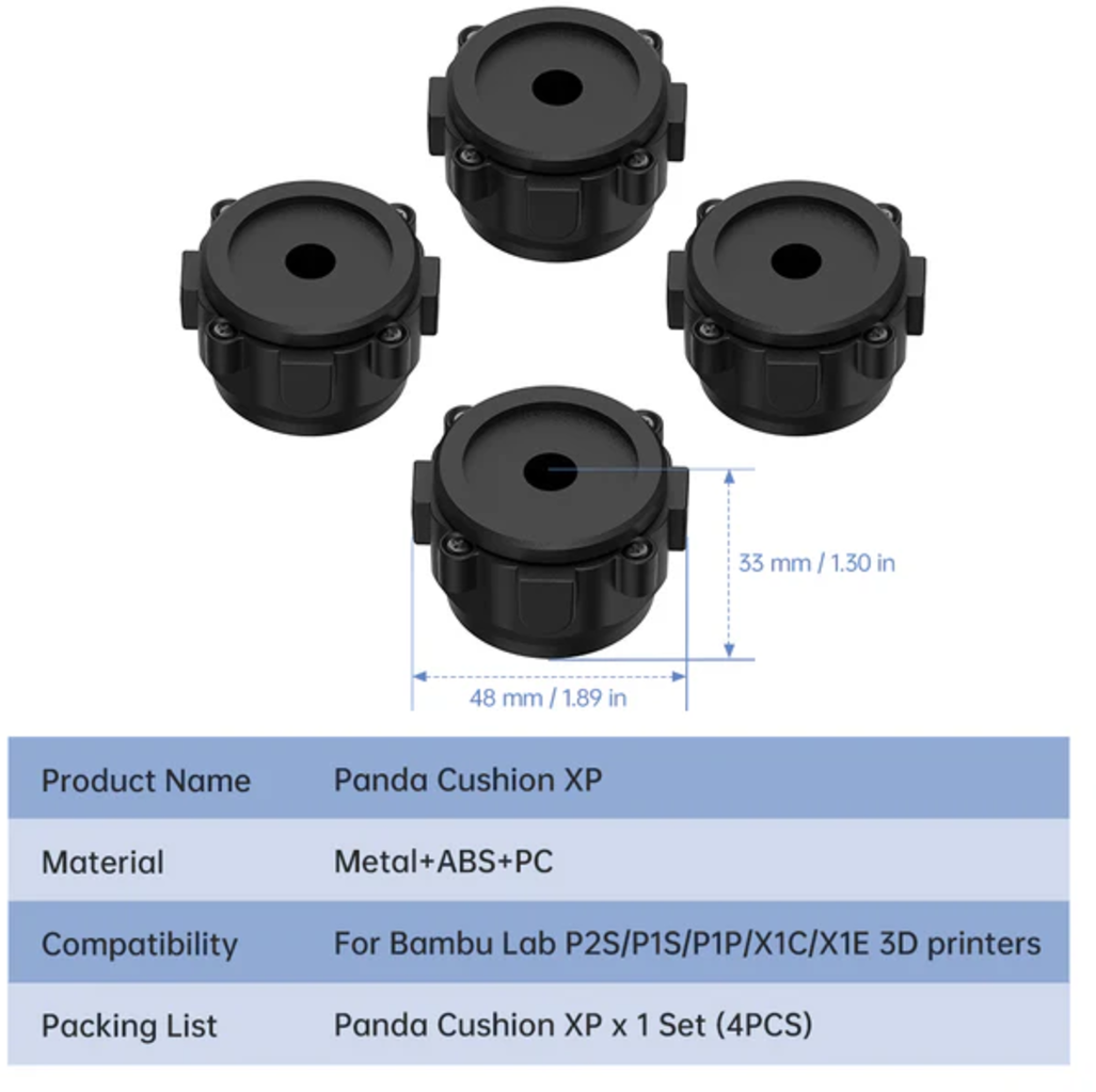 BIQU Panda Cushion XP sú tlmiace nožičky navrhnuté na zlepšenie stability tlačiarní Bambu Lab a zároveň na zníženie vibrácií a hluku. Využívajú konštrukciu s veľkoplošnými guličkovými ložiskami na minimalizáciu bočných vibrácií a zvýšenie kvality tlače (napr. redukciou ghostingu).