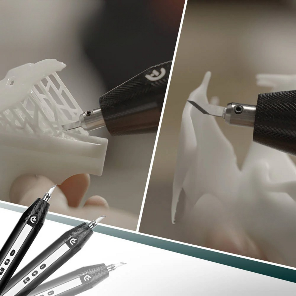 Konštrukcia v tvare pera s takmer 30° ostrým hrotom umožňuje presnú kontrolu nad hĺbkou a rozsahom rezu - ideálna na jemnú prácu, ako sú papierové modely alebo malé plastové diely. Integrované LED svetlo osvetľuje pracovnú plochu a zabezpečuje presnosť aj pri slabom osvetlení.
