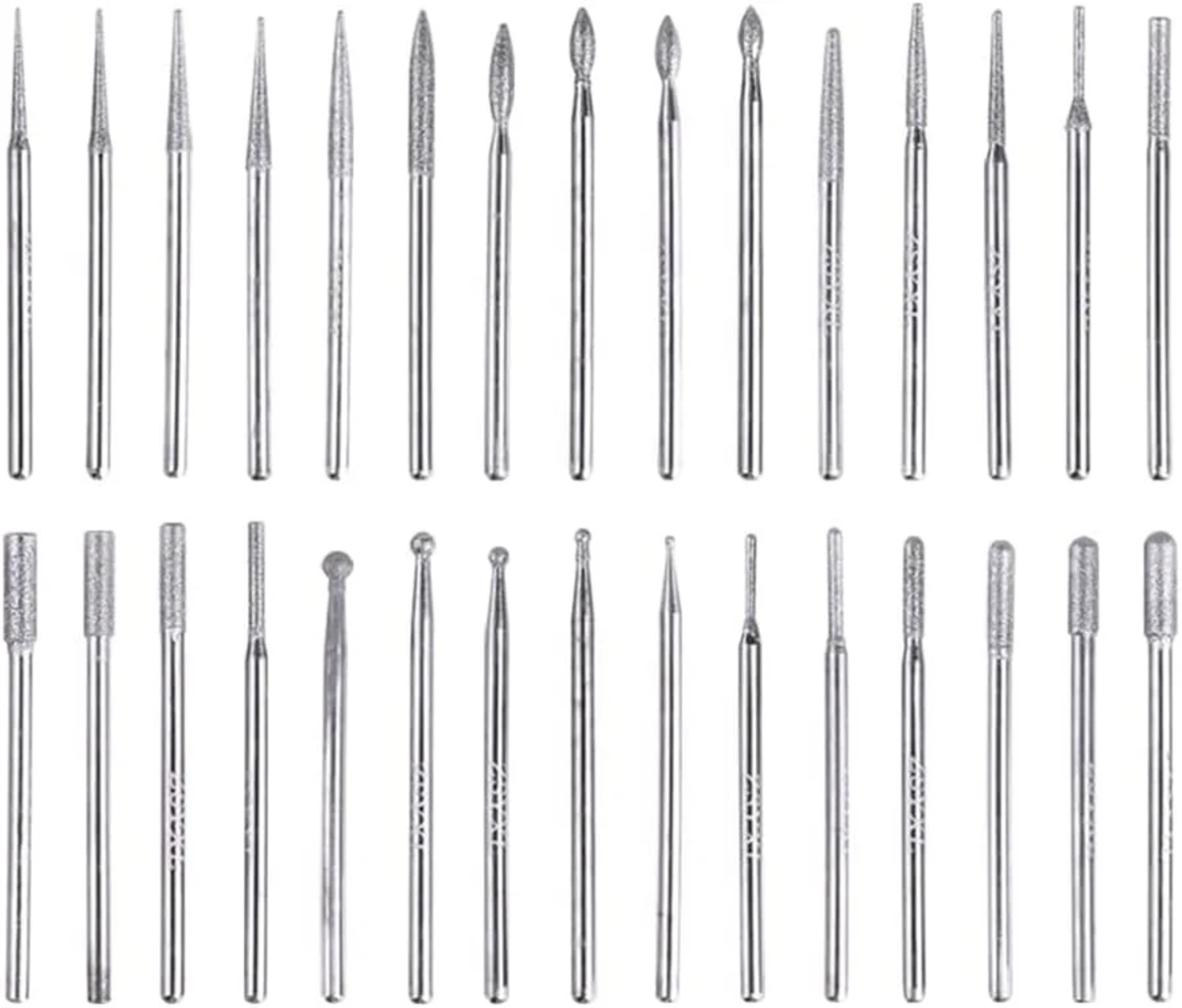 Diamond Grinding Bits Set od Hanboost obsahuje 30 vysokokvalitných diamantových bitov rôznych tvarov a zrnitosti od 120 do 150. Bity sú vyrobené z robustného zliatinového materiálu s hlavou pokrytou odolnými diamantovými časticami a ponúkajú vysokú stabilitu a čisté výsledky. S priemerom stopky 2,35 mm a dĺžkou 45 mm sú kompatibilné s väčšinou bežne dostupných rotačných nástrojov.