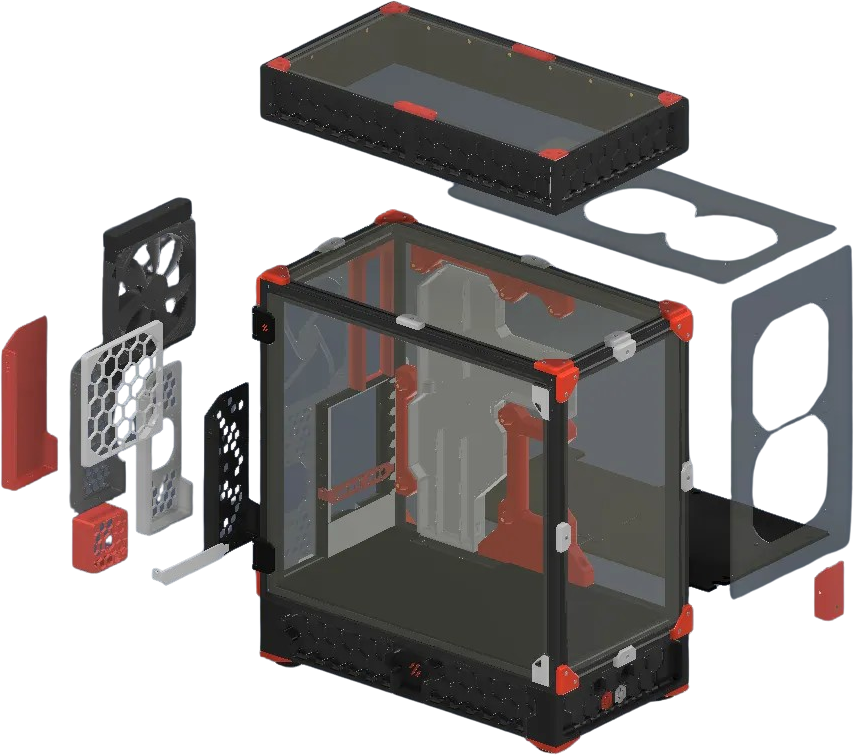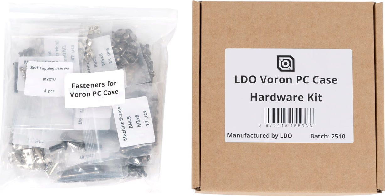 Voron PC Case Kit je modulárny, 3D tlačený počítačový kryt, ktorý do sveta PC prináša nezameniteľný štýl Voron. Sada obsahuje všetky mechanické komponenty na zostavenie krytu - vrátane špeciálne navrhnutých dielov LDO, ako sú spínače a doska plošných spojov. PC komponenty alebo panely nie sú súčasťou balenia (voliteľne sú k dispozícii samostatne).