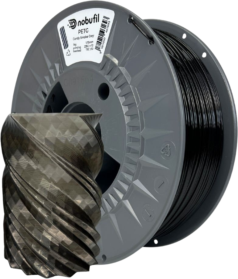 PETG od spoločnosti Nobufil je recyklovaný filament vyrobený z plastového odpadu, ktorý sa vyznačuje vynikajúcou priľnavosťou vrstiev, odolnosťou a robustnosťou. Materiál má vysokú odolnosť voči nárazom a podobnú teplotnú odolnosť a pevnosť ako ABS.