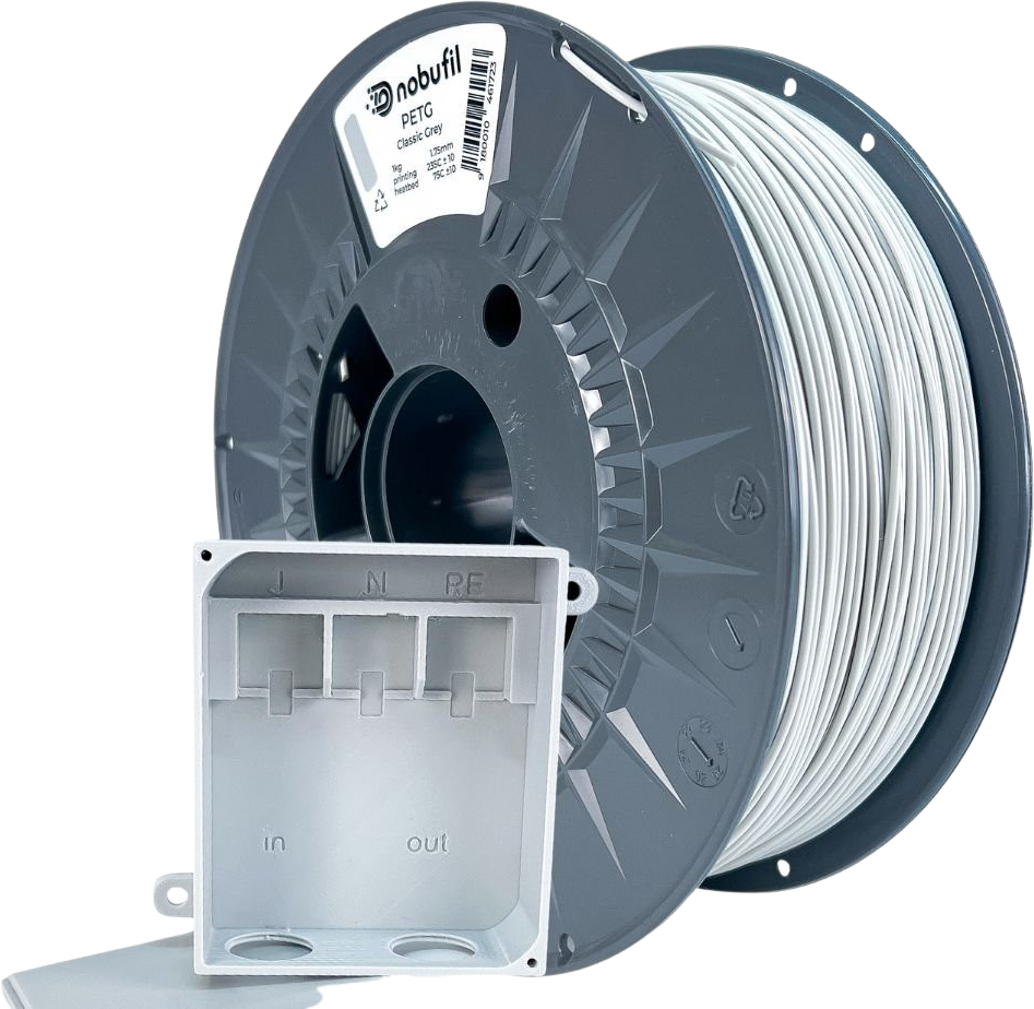 PETG od spoločnosti Nobufil je recyklovaný filament vyrobený z plastového odpadu, ktorý sa vyznačuje vynikajúcou priľnavosťou vrstiev, odolnosťou a robustnosťou. Materiál má vysokú odolnosť voči nárazu a podobnú teplotnú odolnosť a pevnosť ako ABS.