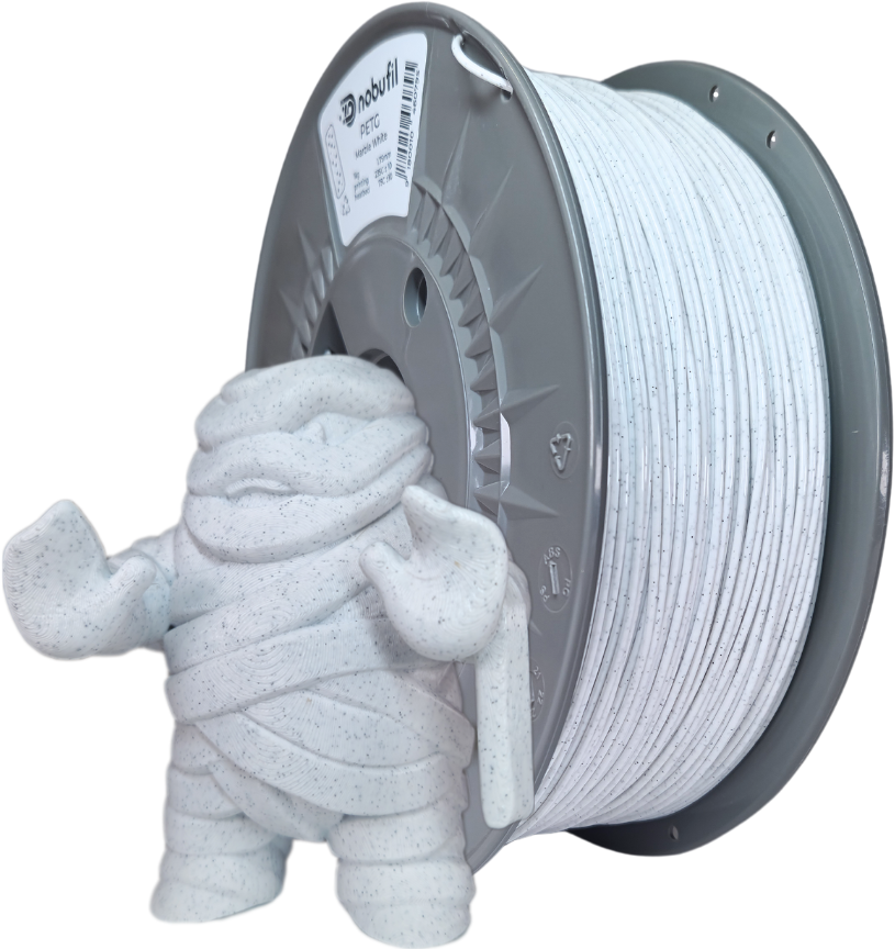 PETG značky Nobufil je recyklovaný filament vyrobený z plastového odpadu, ktorý sa vyznačuje vynikajúcou priľnavosťou vrstiev, odolnosťou a robustnosťou. Materiál má vysokú odolnosť proti nárazu a podobnú teplotnú odolnosť a pevnosť ako ABS.