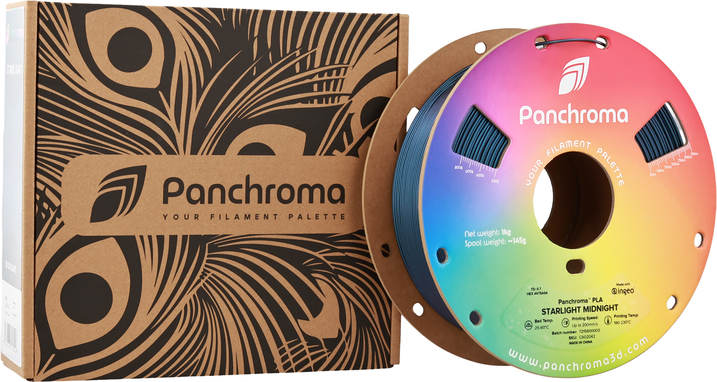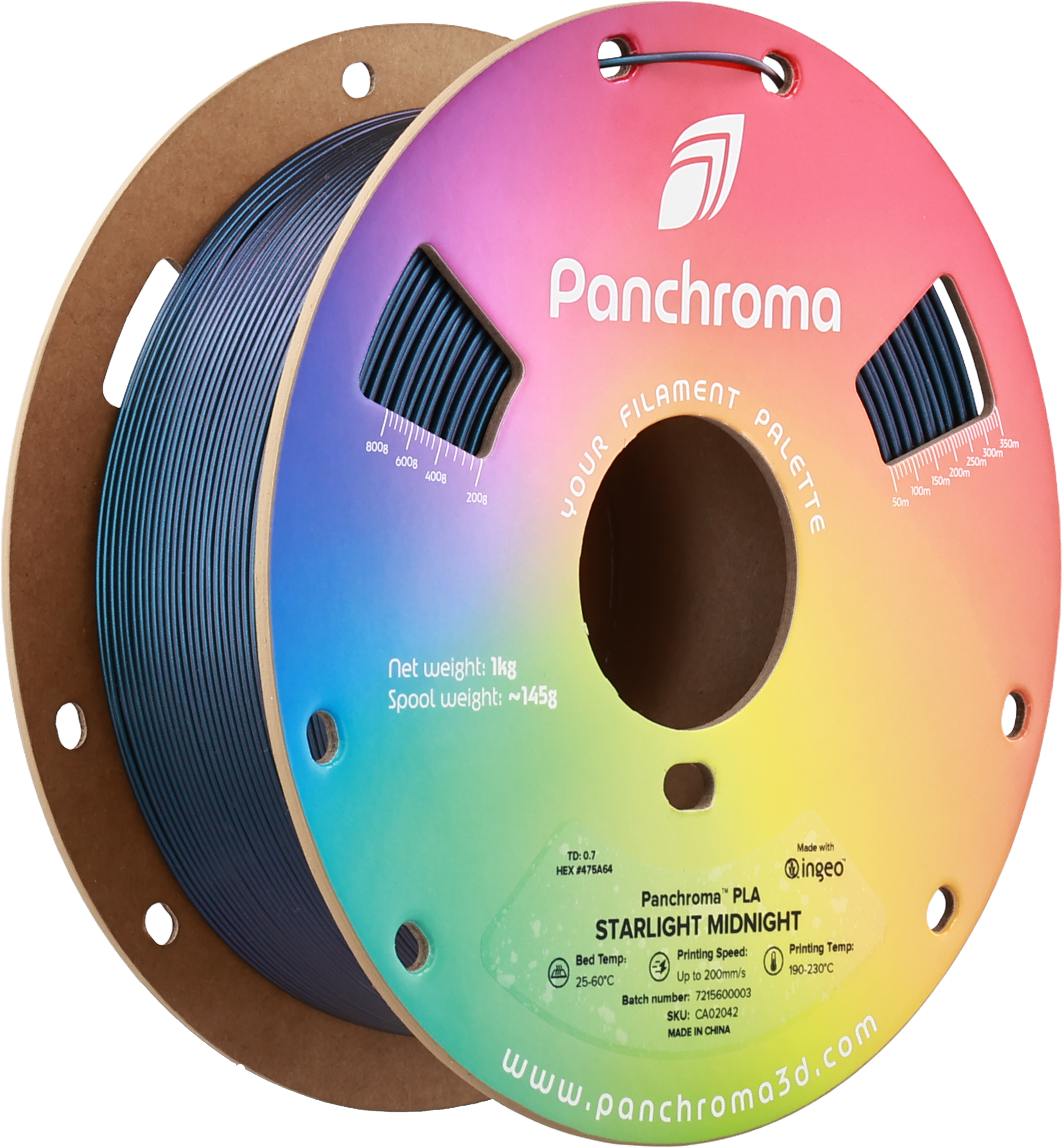 Nechajte svoje 3D výtlačky zažiariť! S filamentom Panchroma™ Starlight PLA od spoločnosti Polymaker môžete na svojich výtvoroch vyčarovať jedinečný trblietavý efekt, ktorý mení farbu v závislosti od dopadu svetla. Tento fascinujúci efekt dodá vašim modelom dynamiku - ako trblietajúce sa hviezdy tancujúce na nočnej oblohe.