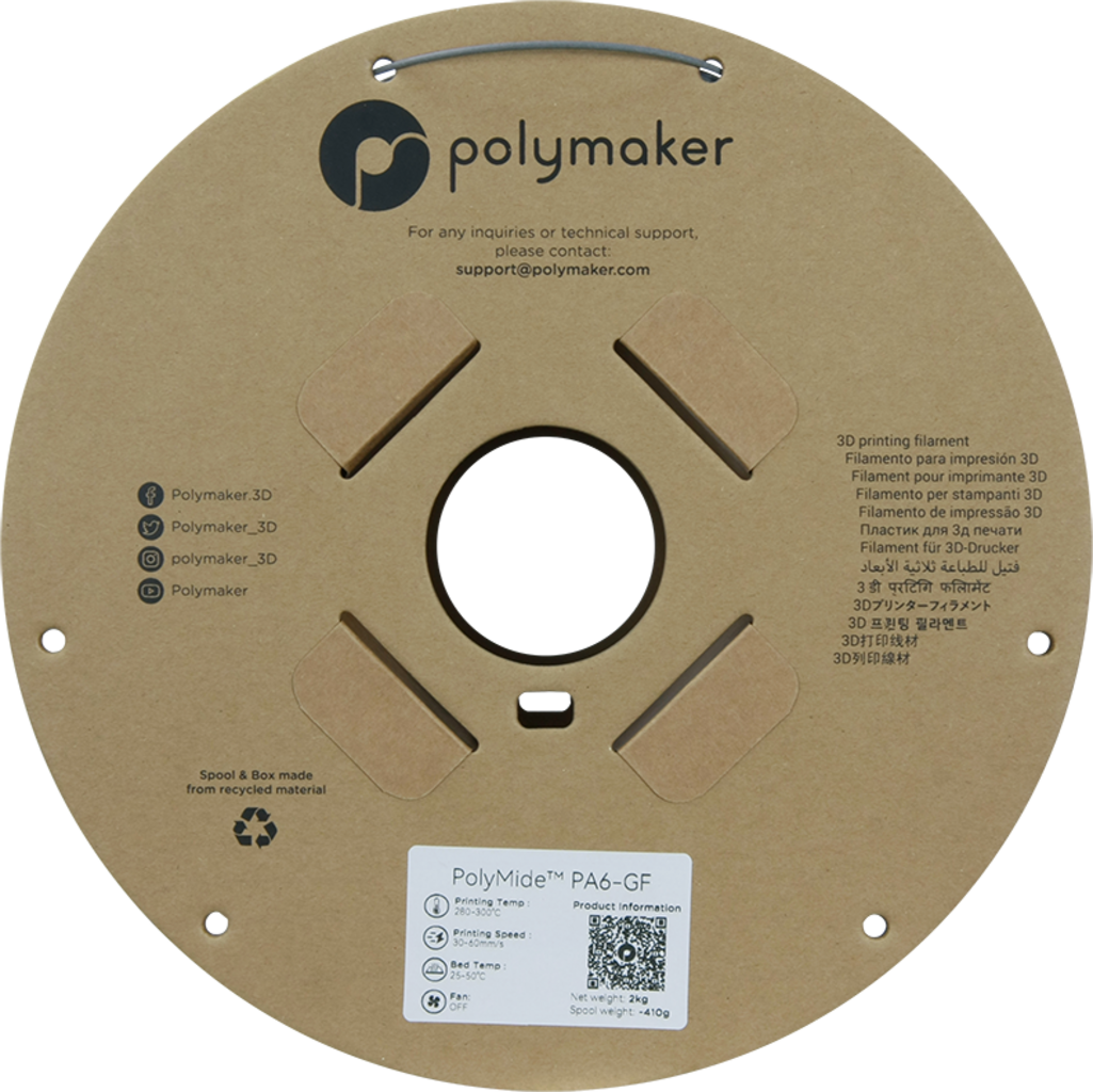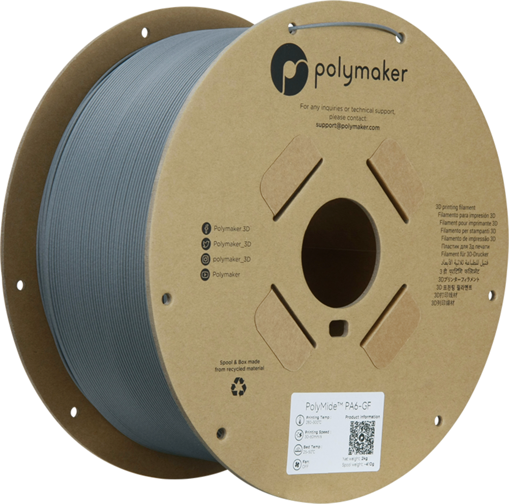 PolyMide™ PA6-GF je PA6 filament zosilnený sklenenými vláknami (nylon 6). Materiál má vynikajúce tepelné a mechanické vlastnosti bez ovplyvnenia priľnavosti vrstvy.