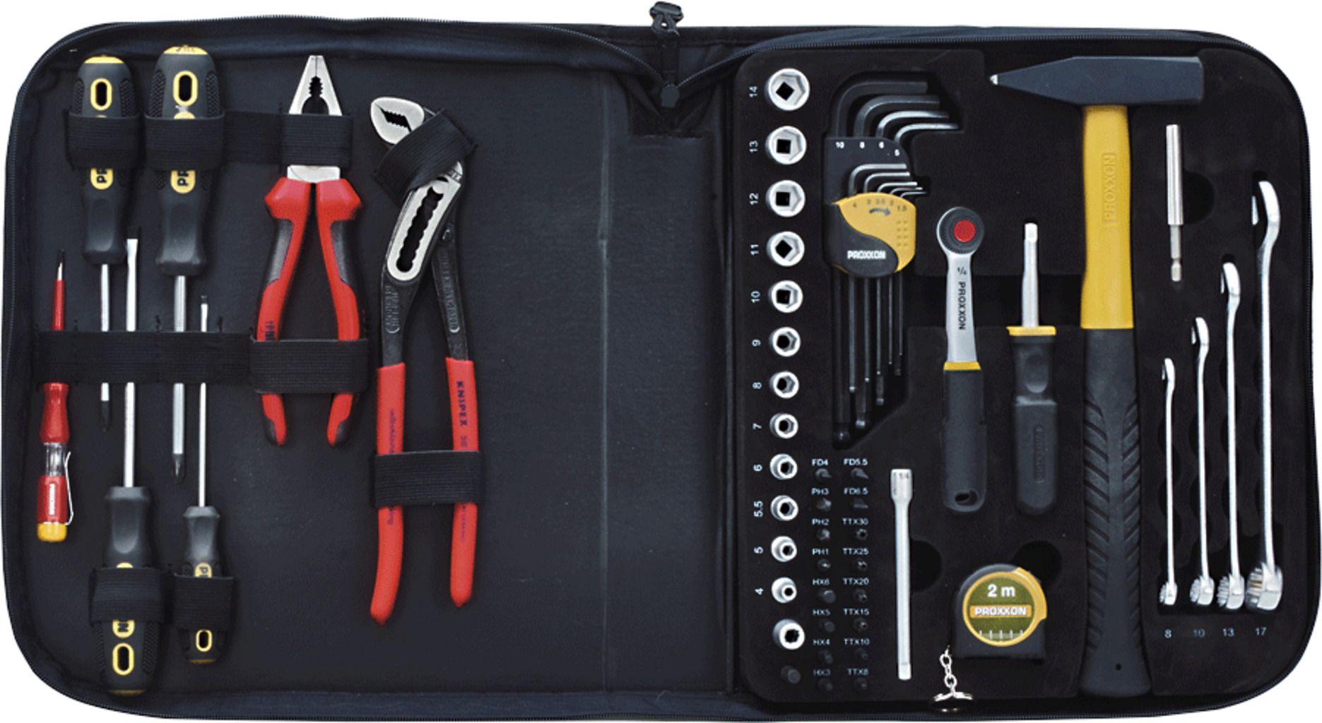 Univerzálna taška na náradie PROXXON je univerzálny, kompaktne usporiadaný systém náradia na montážne, údržbárske a opravárenské práce. Kombinuje starostlivo vybraný sortiment vysokokvalitného ručného náradia v odolnej, funkčnej textilnej taške.