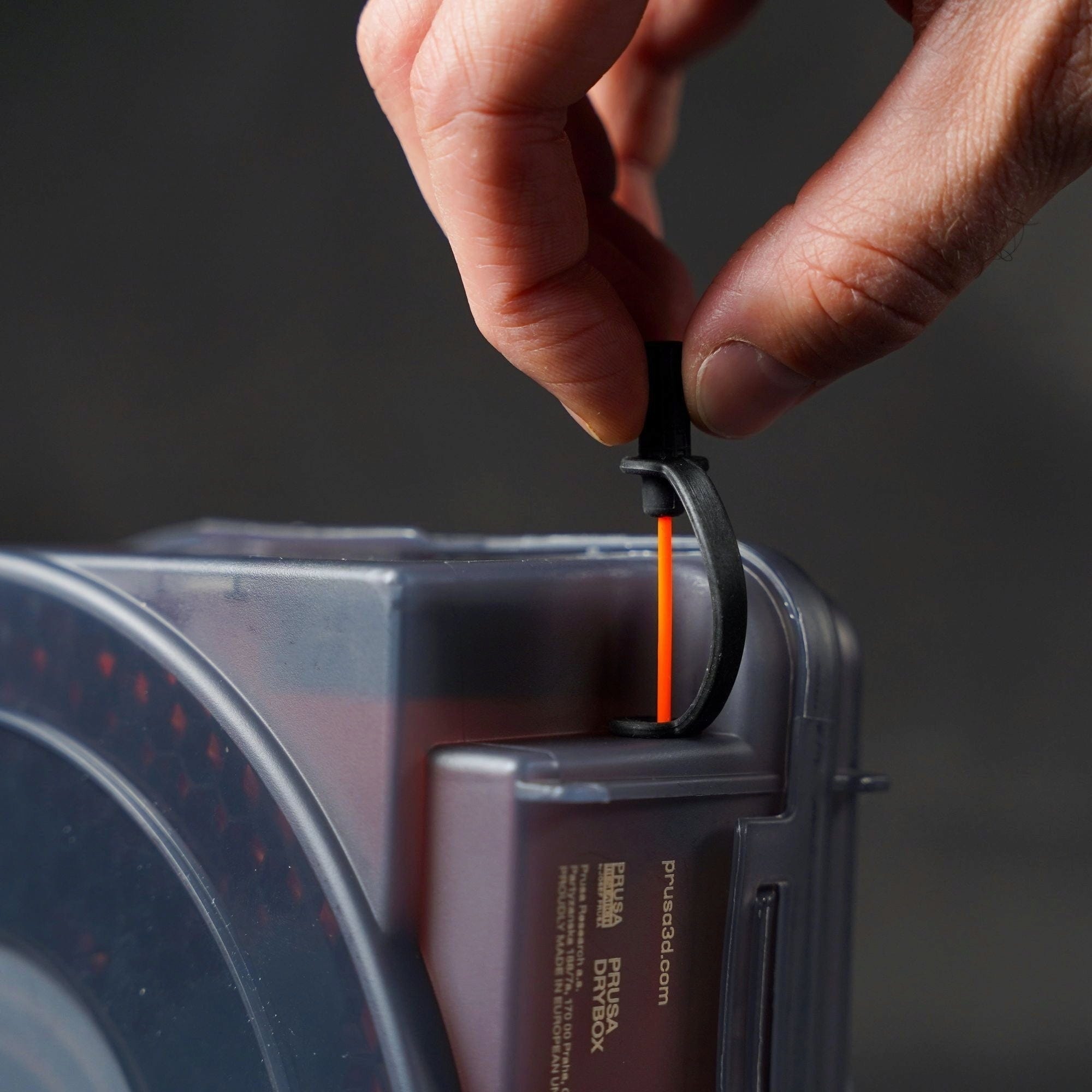 Inteligentný Drybox bol od základu vyvinutý na skladovanie filamentov a priamu tlač. Namiesto improvizovaných skladovacích riešení získate premyslený systém: vložte cievku, tlačte priamo z boxu a skladujte ju chránenú až do posledného metra. Vďaka použitiu hydrofóbnych materiálov a vysokohustotnému tesneniu zostáva vlhkosť vo vnútri neustále nízka. Rýchlo prístupné otvory vám tiež umožňujú vložiť filament bez toho, aby ste museli otvárať škatuľu: v kombinácii s teflónovou trubičkou možno filament vkladať priamo do tlačiarne, pričom box zostáva úplne uzavretý.