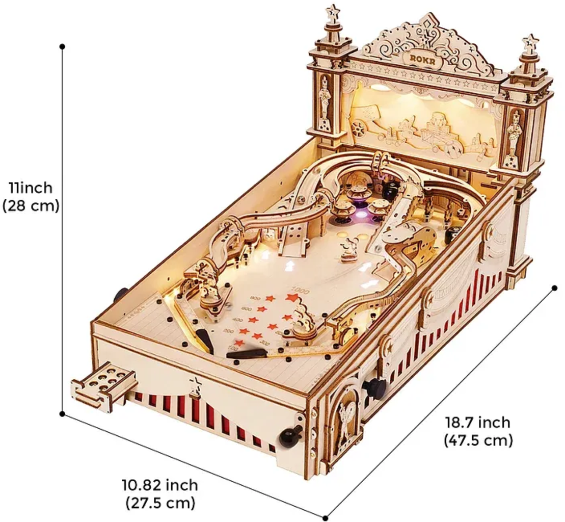 3D Pinball Machine ROKR prináša vzrušenie z klasického arkádového pinballu - ako plne funkčná drevená 3D skladačka, ktorú si sami postavíte od základov.