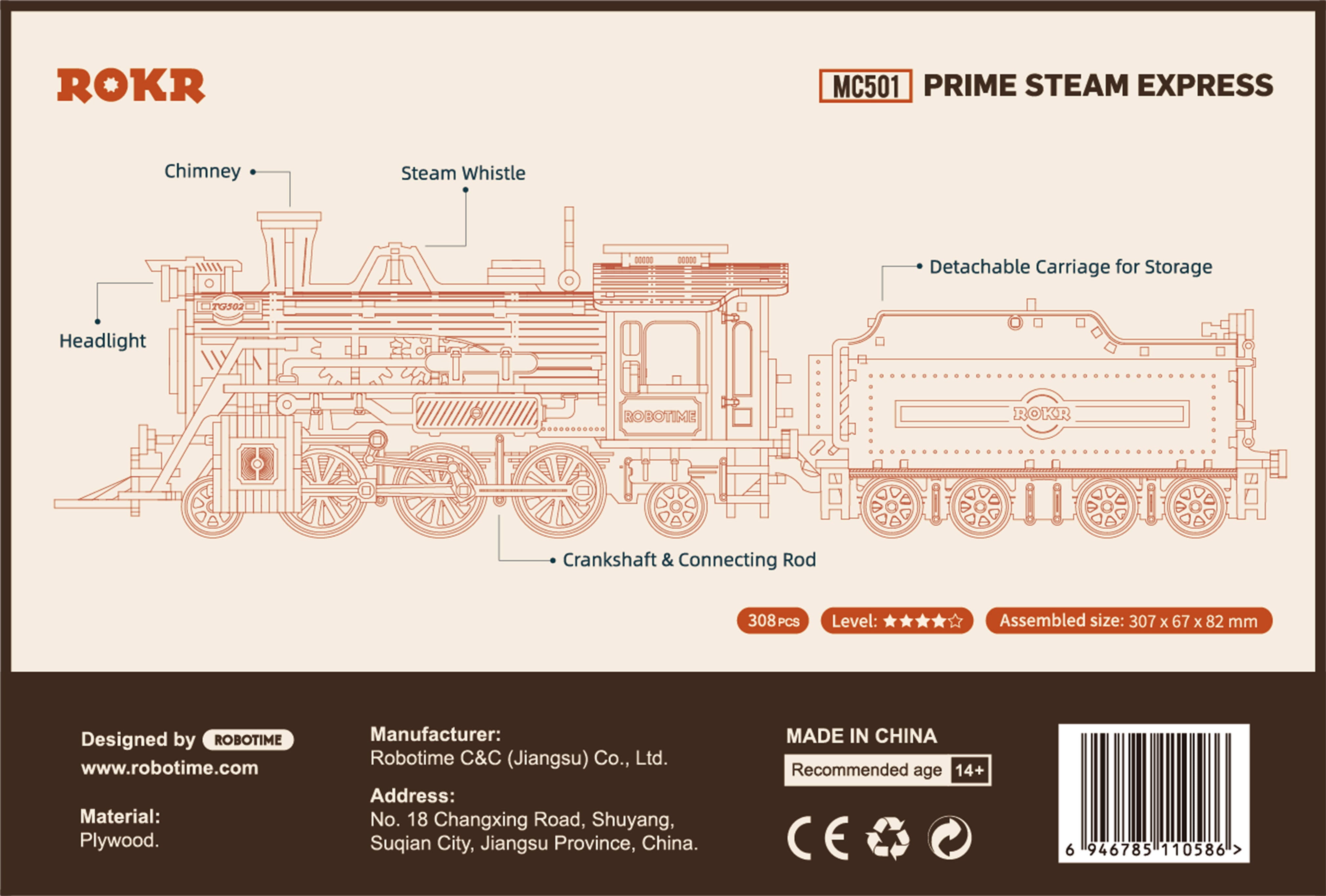 ROKR Prime Steam Express je mechanická 3D drevená skladačka, ktorá vás prenesie do zlatého veku parných lokomotív. Do čias, keď fungovali ozubené kolesá, dýchali piesty a bolo vidieť technológiu. Pri stavaní kúsok po kúsku sa vytvára lokomotíva, ktorá nielen jazdí, ale aj rozpráva príbeh.