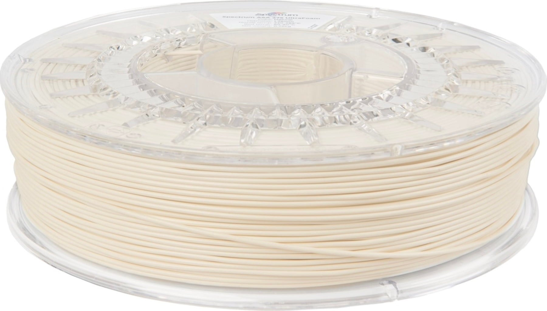 Spectrum LW-ASA UltraFoam je špecializovaný vysoko výkonný filament, ktorý kombinuje vlastnosti ASA odolné voči poveternostným vplyvom a UV žiareniu s technológiou aktívneho penenia. Vďaka riadenej expanzii počas procesu tlače možno dosiahnuť výraznú úsporu hmotnosti - v extrémnych prípadoch až trojnásobné zväčšenie objemu pri súčasne zníženej hustote približne 0,33 g/cm³. Vďaka tomu je tento materiál ideálny pre aplikácie, pri ktorých sú rovnako dôležité hmotnosť, mechanická pevnosť a odolnosť voči poveternostným vplyvom.