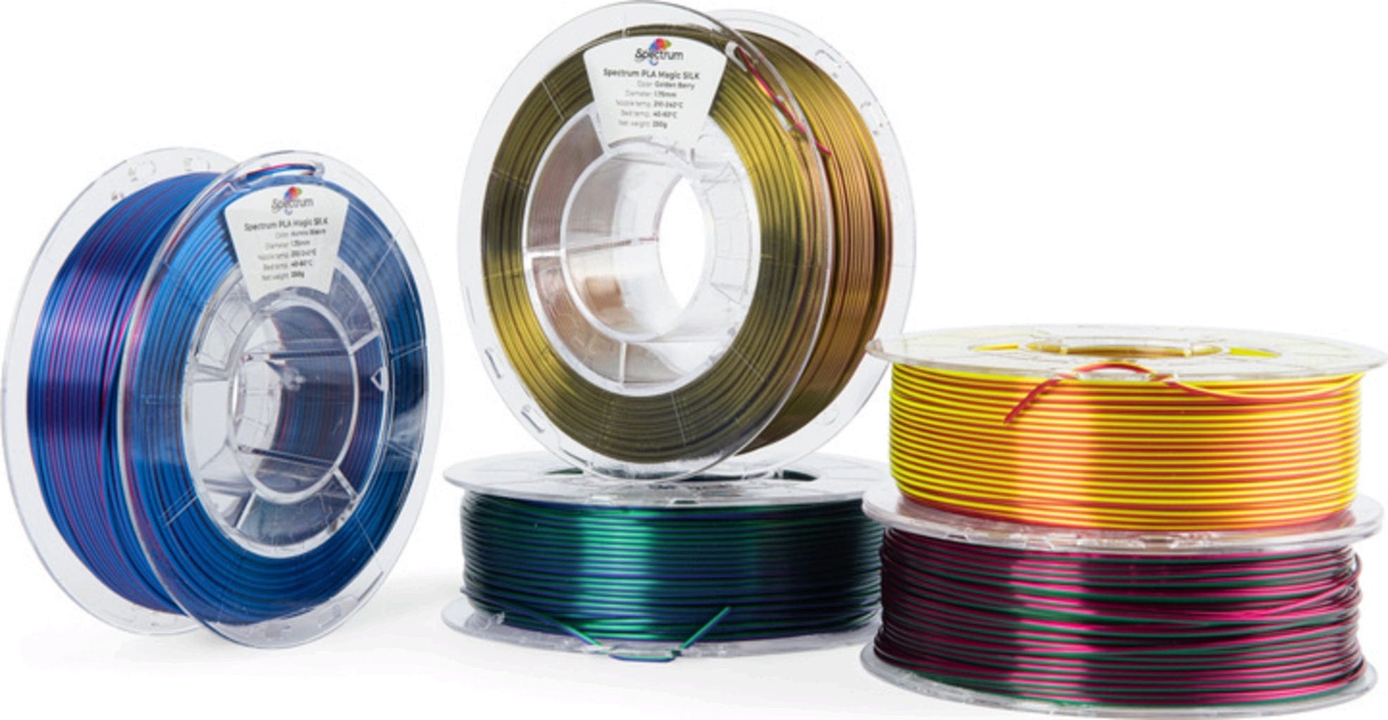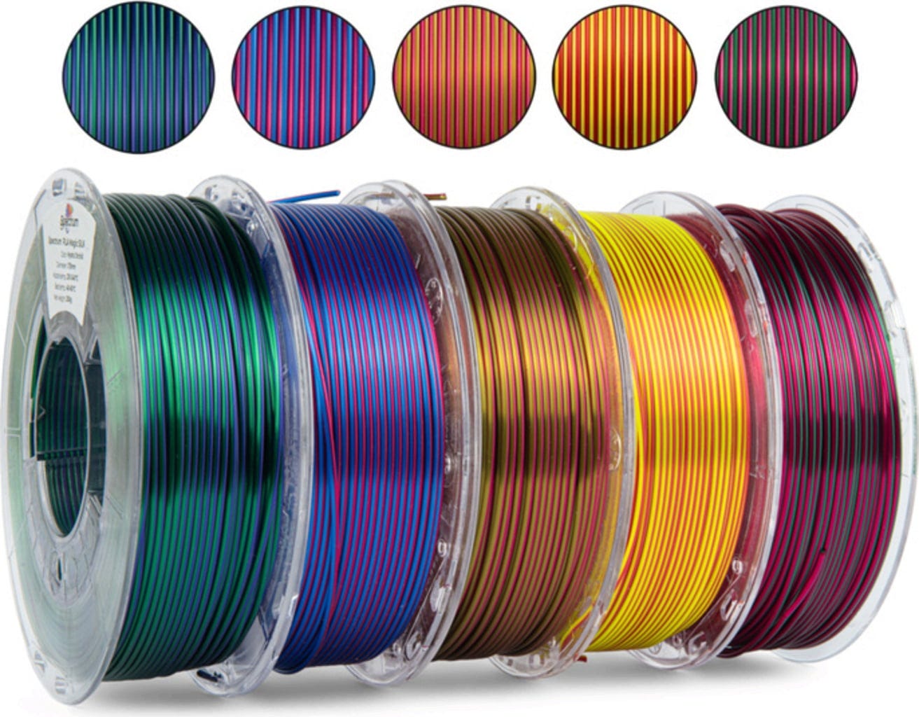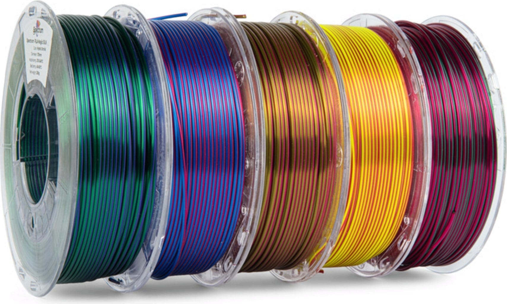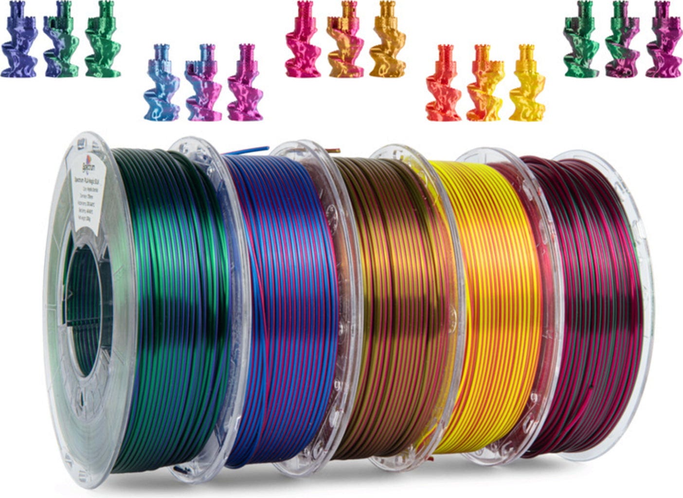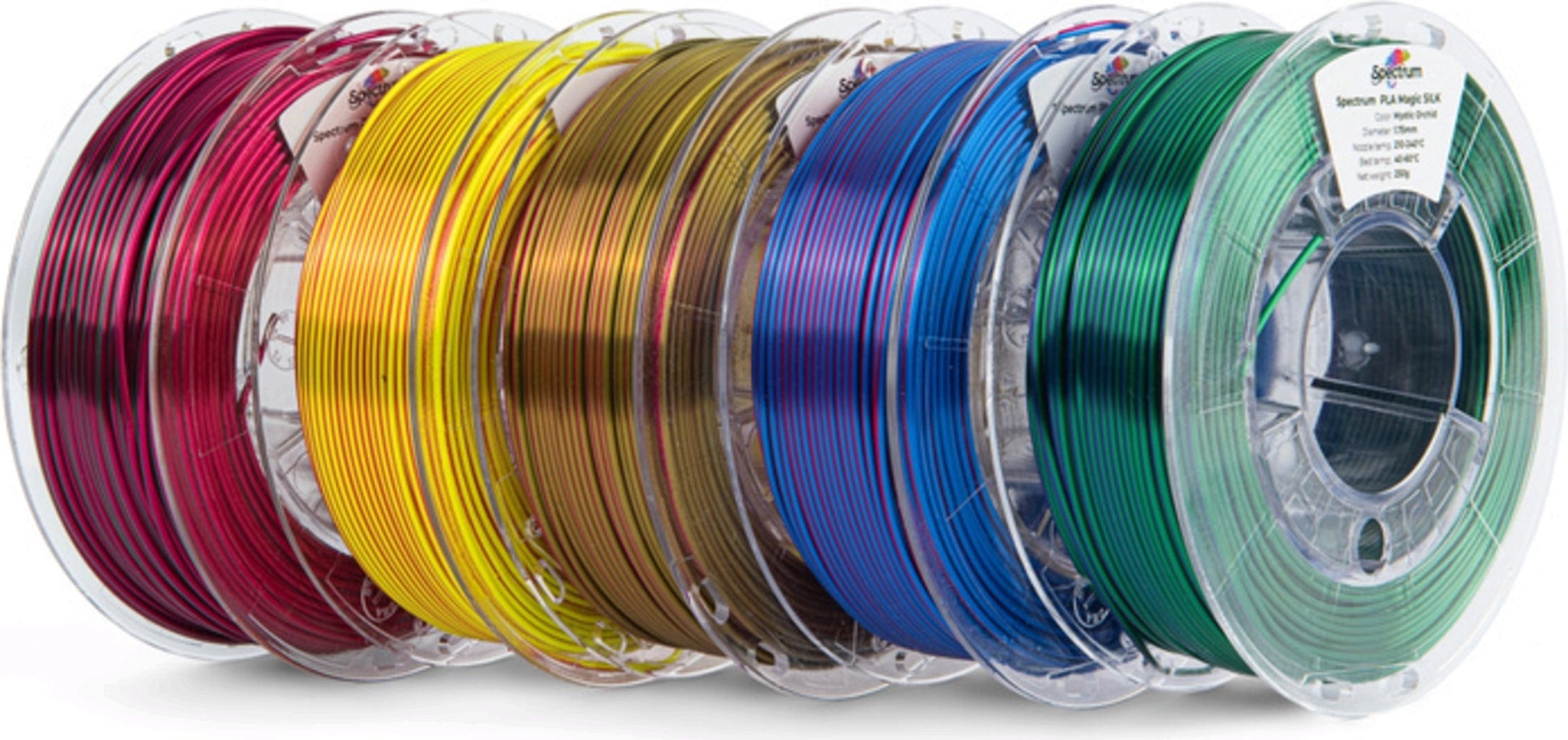 5-dielna sada Spectrum Magic Silk PLA bola vyvinutá pre všetkých, ktorí od 3D tlače očakávajú nielen funkčnosť, ale aj maximálny vizuálny efekt. Vďaka modernej koextrúzii kombinuje tento filament dve farby, čím vytvára pôsobivé zmeny farieb, ktoré sa menia v závislosti od dopadu svetla a uhla pohľadu.