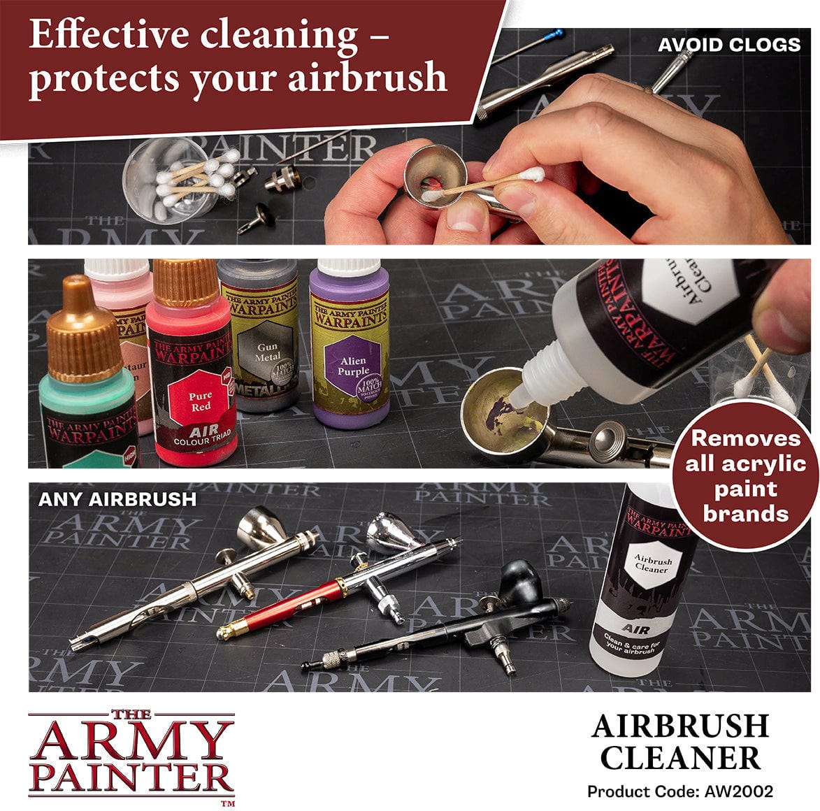 Army Painter Airbrush Cleaner je špeciálne vyvinutý čistiaci prostriedok na dôkladné odstraňovanie zvyškov akrylovej farby, a to aj v ťažko prístupných oblastiach airbrushu. Zloženie na báze vody zaručuje šetrné a účinné čistenie bez poškodenia citlivých súčastí.