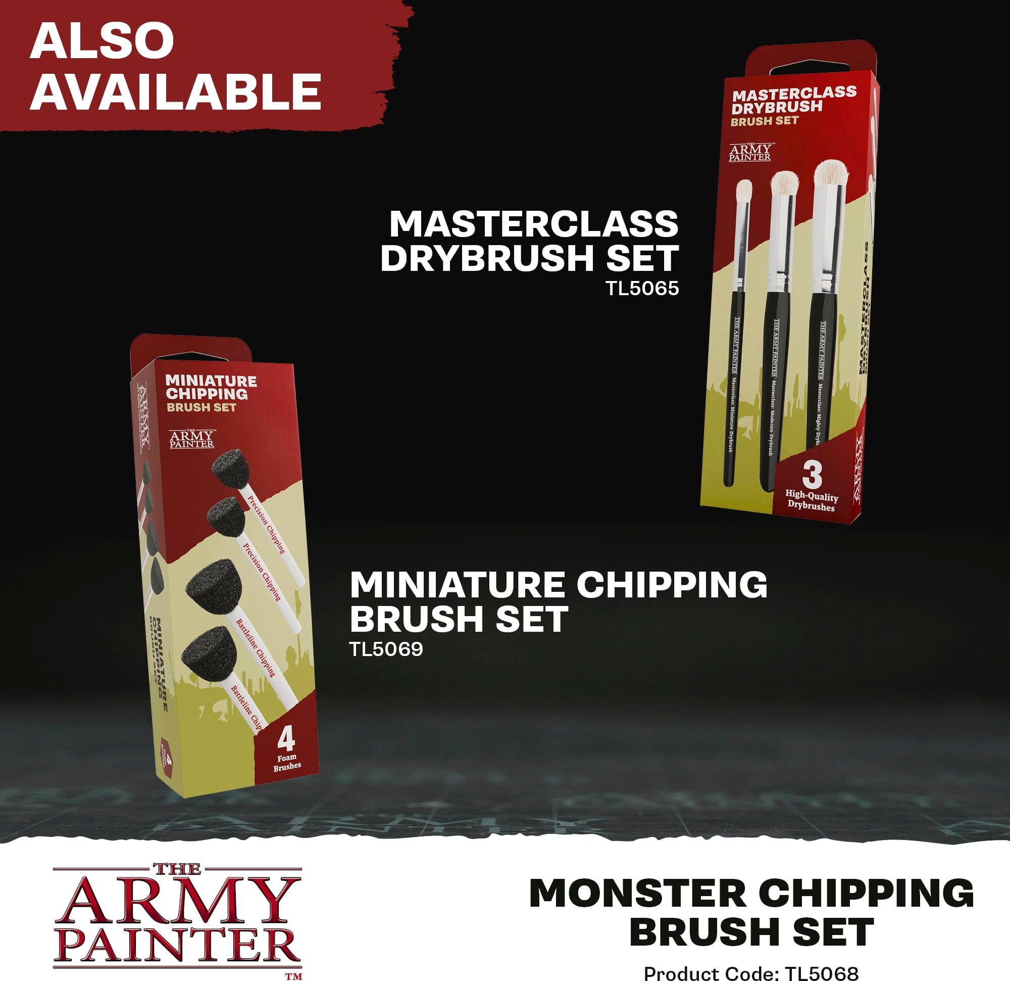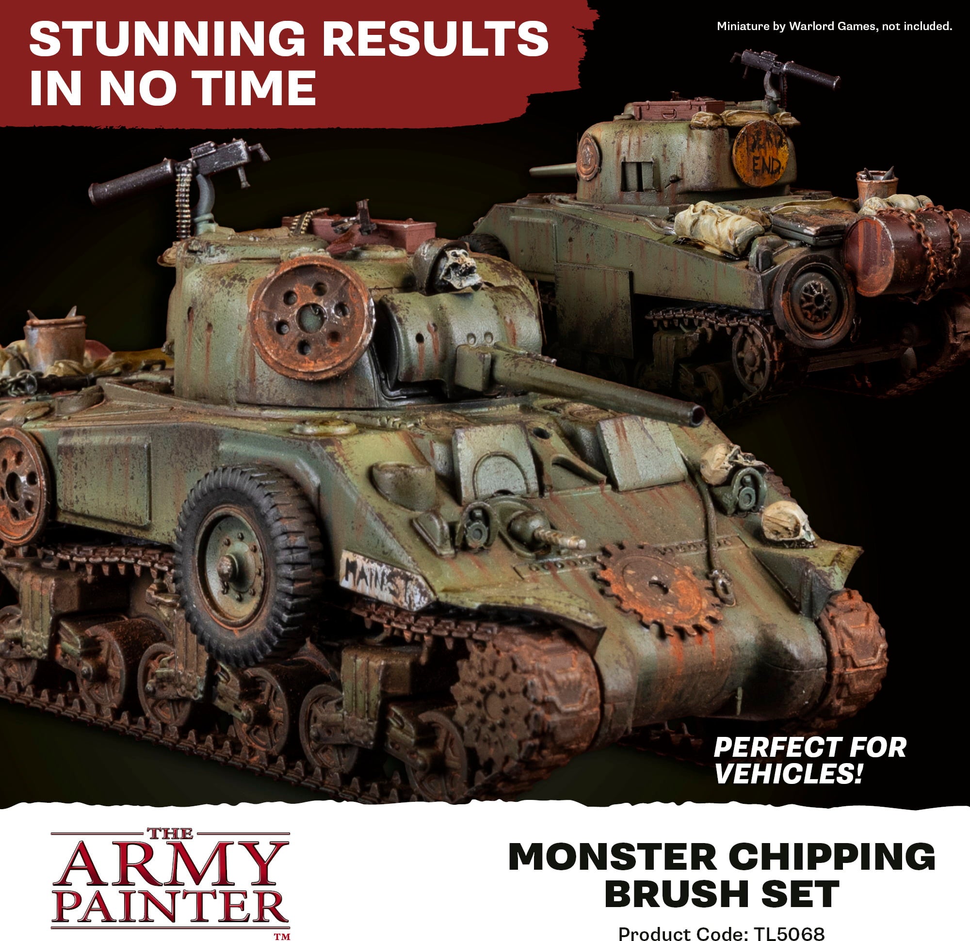 Monster Chipping Brush Set od spoločnosti The Army Painter je dokonalým nástrojom na vytváranie realistických efektov starnutia a opotrebovania terénnych figúrok a veľkých miniatúr. Pomocou týchto mimoriadne veľkých štetcov môžete ľahko vytvoriť škrabance, odlúpnutú farbu a opotrebované povrchy, ktoré dodajú vašim modelom autentický "použitý vzhľad".