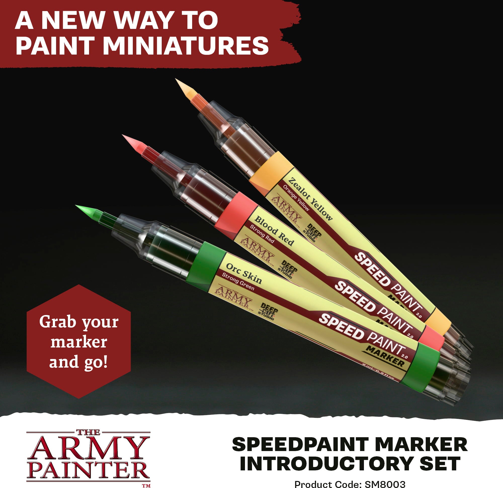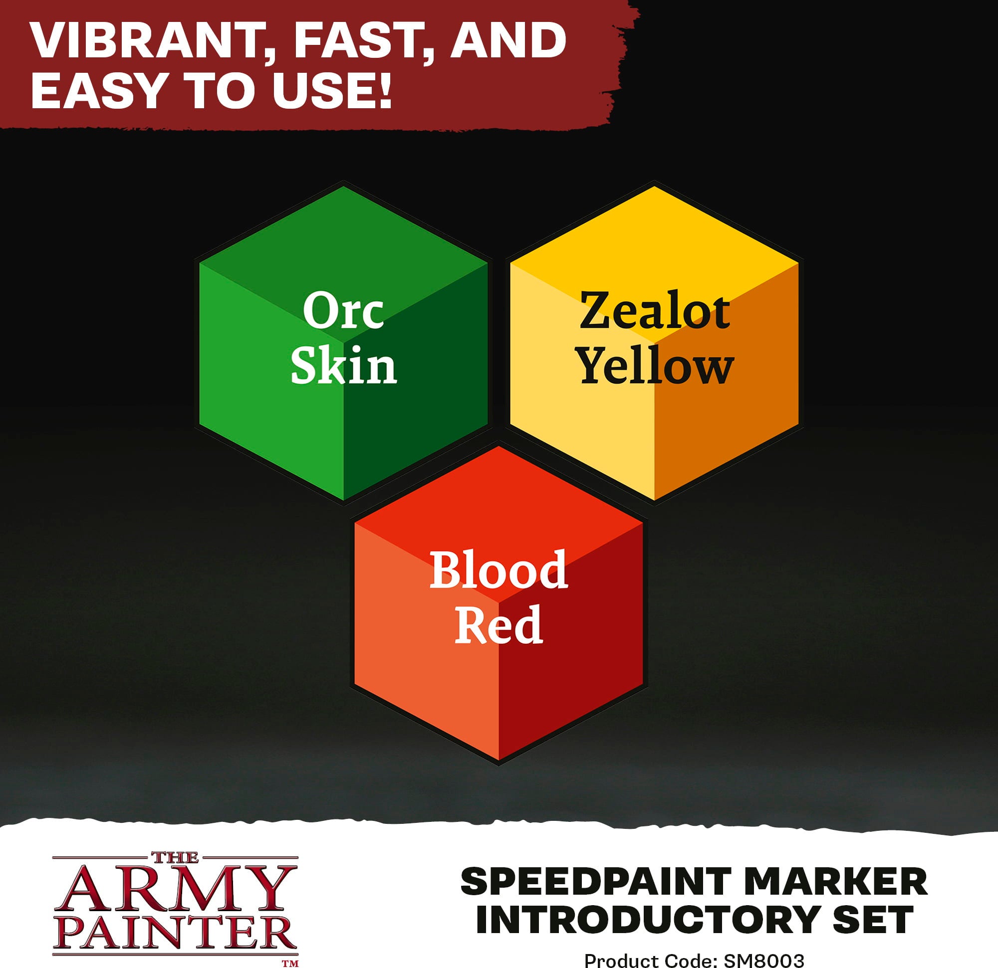 Introductory Set obsahuje tri mimoriadne silné farby: Orc Skin, Zealot Yellow a Blood Red. Fixky sa zmestia do každej tašky - takže si svoje hobby môžete vziať so sebou, kamkoľvek pôjdete!
