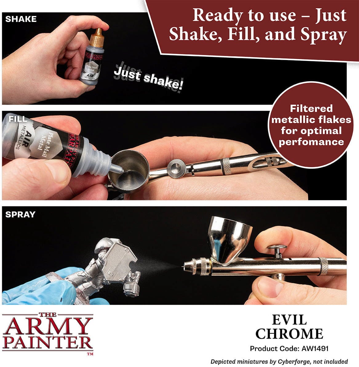 Tieto špeciálne vyvinuté metalické farby sú pripravené na airbrush a poskytnú vám rovnomernú, jemne trblietavú aplikáciu, vďaka ktorej budú kovové povrchy vyzerať realisticky. Ultrajemné brúsené pigmenty poskytujú hladký, reflexný povrch bez pohltenia detailov.